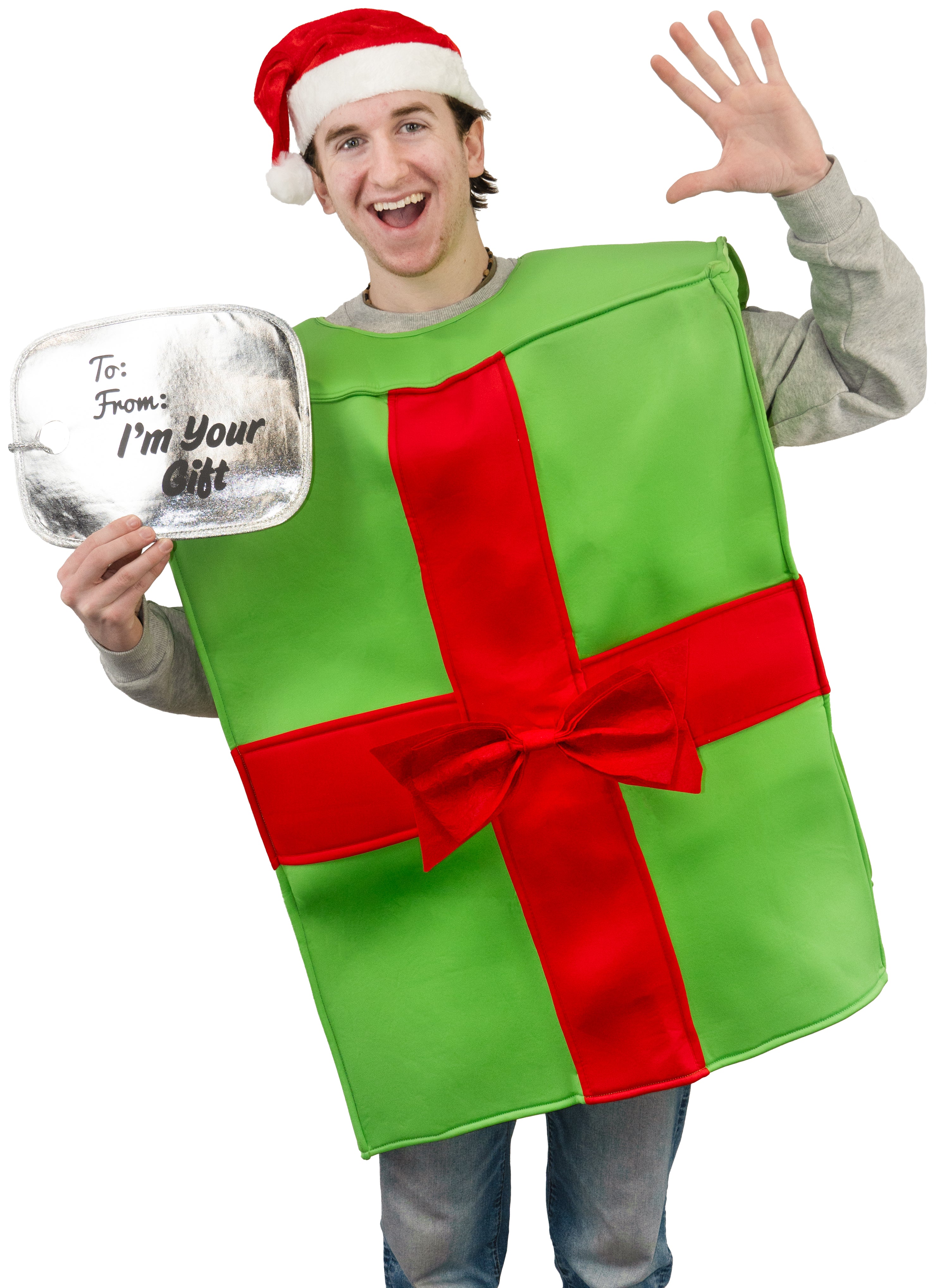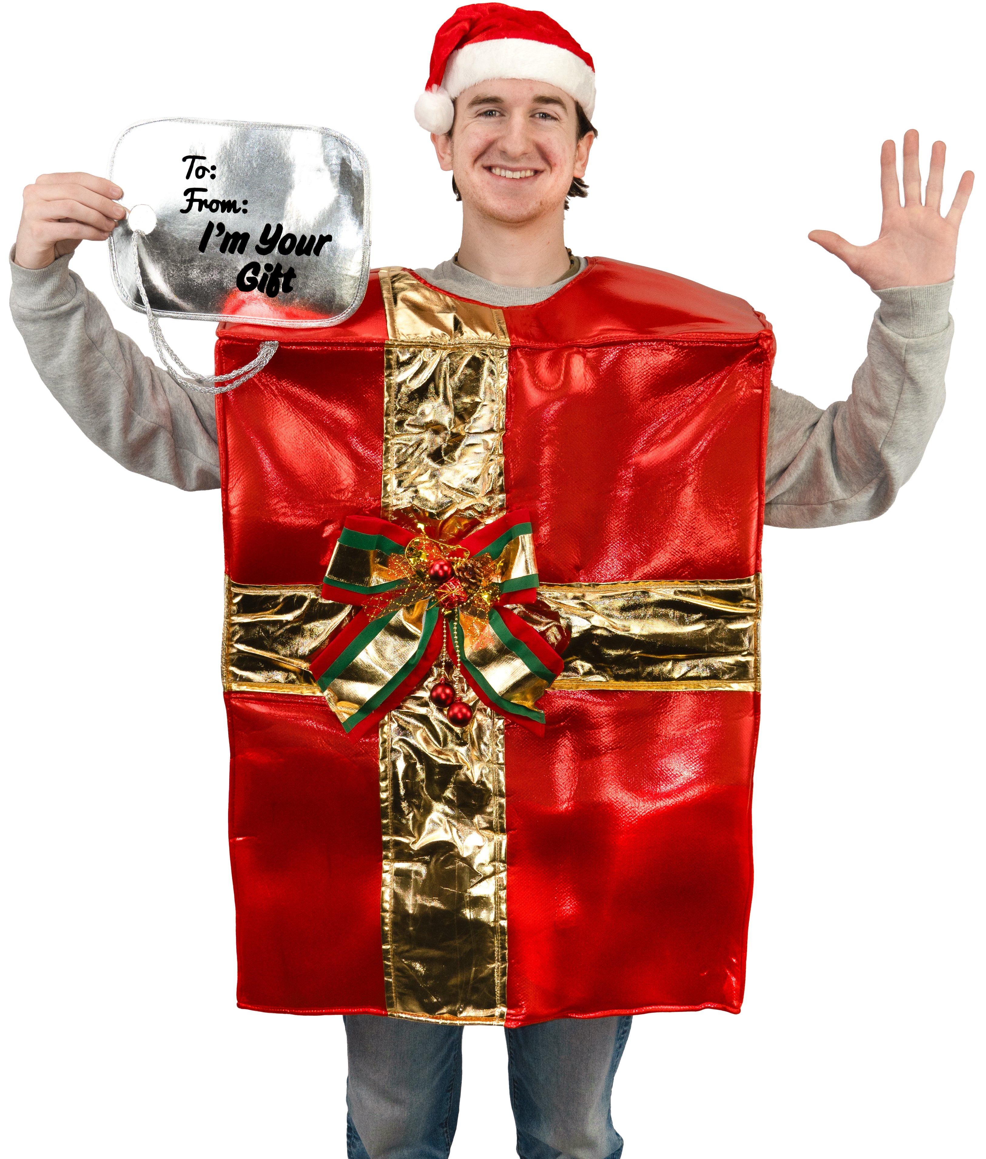 Be everyone's favorite gift with our Adult Present Gift Box Costume! This playful costume features a red bow and a tag that reads "I'm your gift". Perfect for any party or event, this costume will surely get some laughs and make you stand out. Plus, no wrapping required!