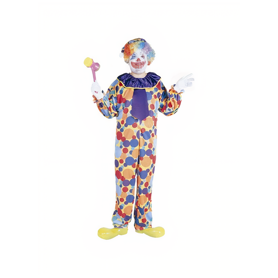 Nuestro disfraz de payaso moteado para adulto incluye un mono multicolor con corbata y sombrero. Peluca y máscara no incluidas.