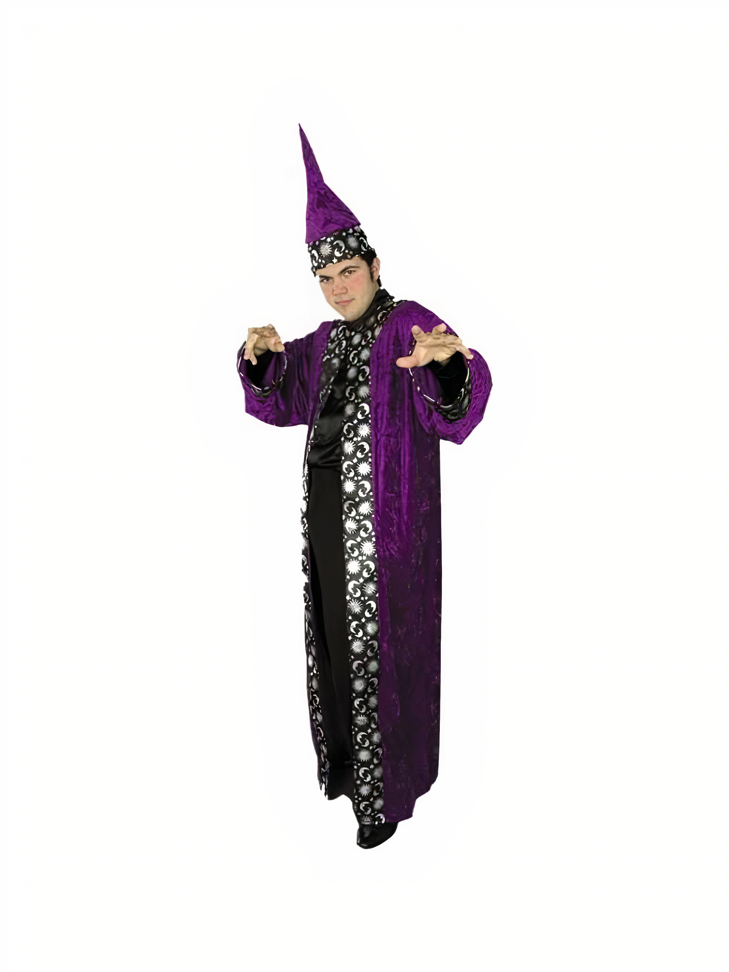 Este disfraz de mago para hombre adulto incluye un sombrero de mago puntiagudo y una túnica de mago larga. Tanto el sombrero como la bata están hechos de panne triturado y detallados con un ribete blanco y negro. Camisa, pantalones y zapatos no incluidos.